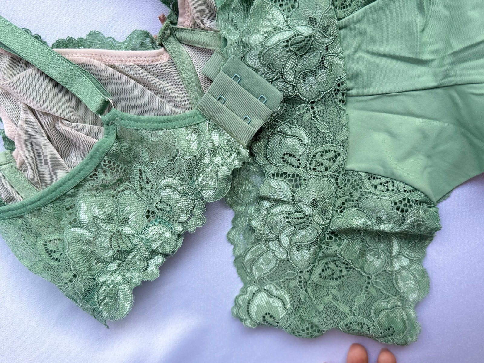 Conjunto verde em renda floral, charmoso e feminino.