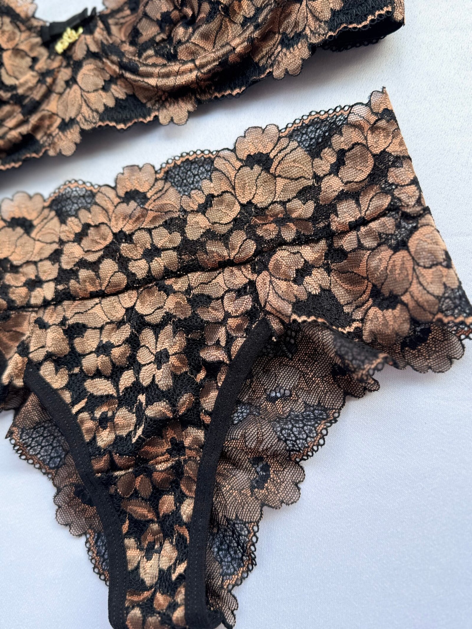 Conjunto em renda preta com fundo bege, estilo retrô.